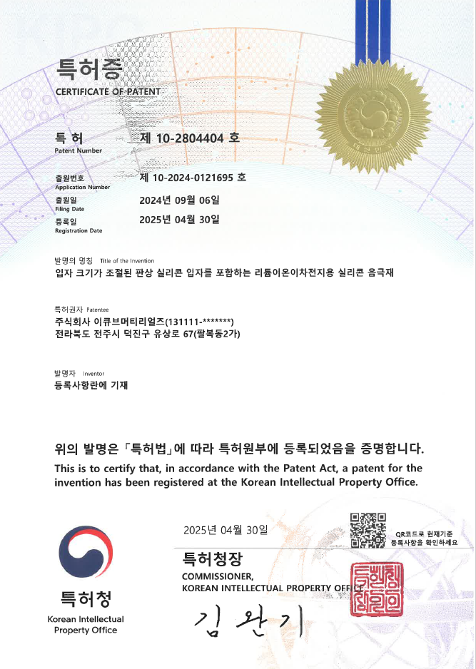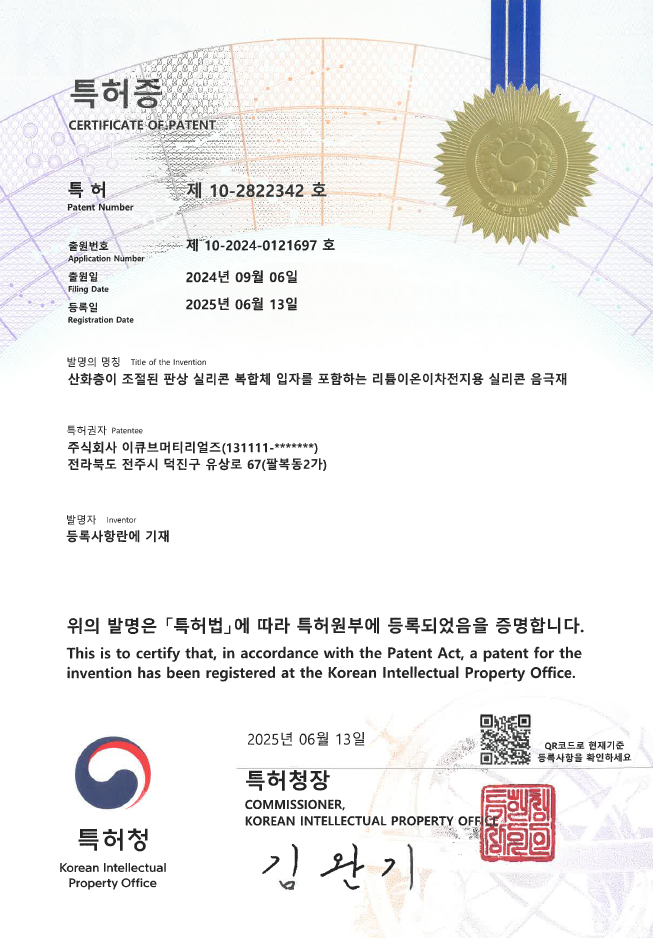 2025 PCT-KR2025-016903 실리콘, 실리카 및 카본 복합 구조형 리튬이온이차전지용 실리콘 음극재