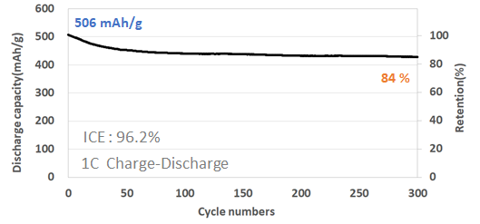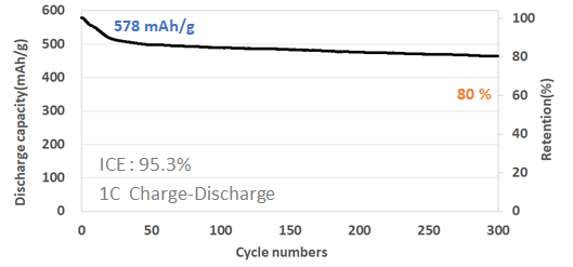 흑연과의 조합 및 탄소나노튜브 바인더 사용 시 흑연 대체 가능 비율과 수명 성능은 향상 될 수 있습니다.