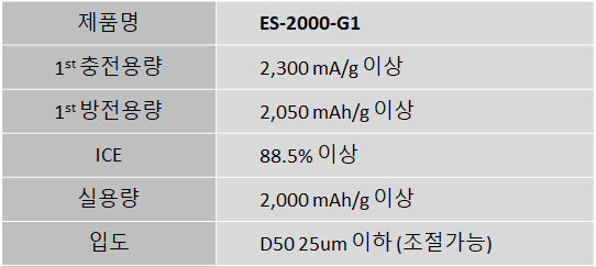 비표면적이 낮고 내부에 팽창 공간이 확보되어 자체 수명이 우수하며 흑연과 같은 크기를 가져서 흑연 대체 가능 비율이 높은 장점을 갖춘 리튬이차전지용 실리콘 음극재입니다.