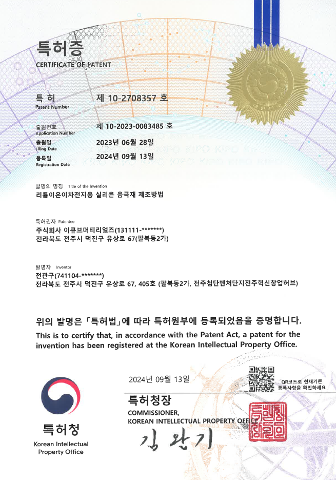 2024 PCT-KR2024-015772 다결정 판상 실리콘 입자를 포함하는 리튬이온이차전지용 실리콘 음극재